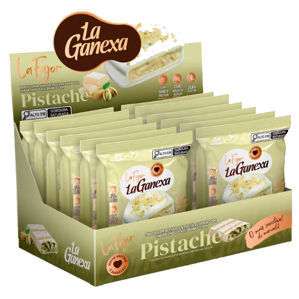 Pistache: Maltitol, gordura vegetal, pasta de amendoim sabor pistache La Ganexa, leite desnatado em pó, amido de mandioca, farinha de arroz, Polidextrose, soro de leite em pó, pistache moído, sal, emulsificantes lecitina de soja e polirricinoleato de Poliglicerol, aromatizantes, espessante goma xantana e edulcorante stevia e Amor. NÃO CONTÉM GLUTEN. CONTEM LACTOSE. ALERGICOS: CONTEM PISTACHE E DERIVADO DE AMENDOIM, LEITE E SOJA. PODE CONTER AVELÃ.