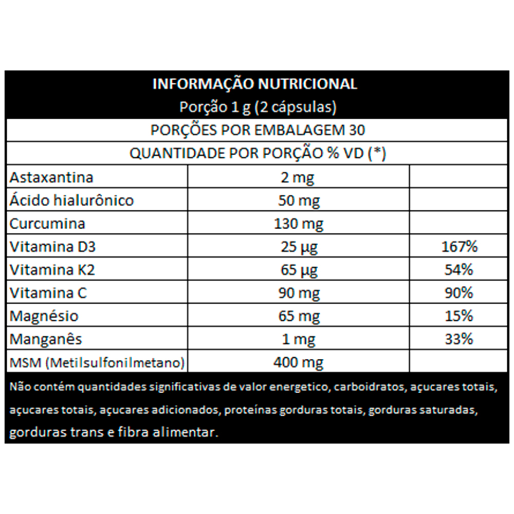 Metilsulfonilmetano (MSM), bisglicinato de magnésio, extrato de rizomas de Cúrcuma longa, ácido ascórbico (vitamina C), hialuronato de sódio, Astaxantina, manganês bisglicinato, menaquinona -7 (vitamina K2), colecalciferol (vitamina D3), estabilizante celulose microcristalina e antiumectante dióxido de silício. Cápsula vegetal: Hidroxipropilmetilcelulose, carragenina e acetato de potássio, NÃO CONTÉM GLÚTEN.