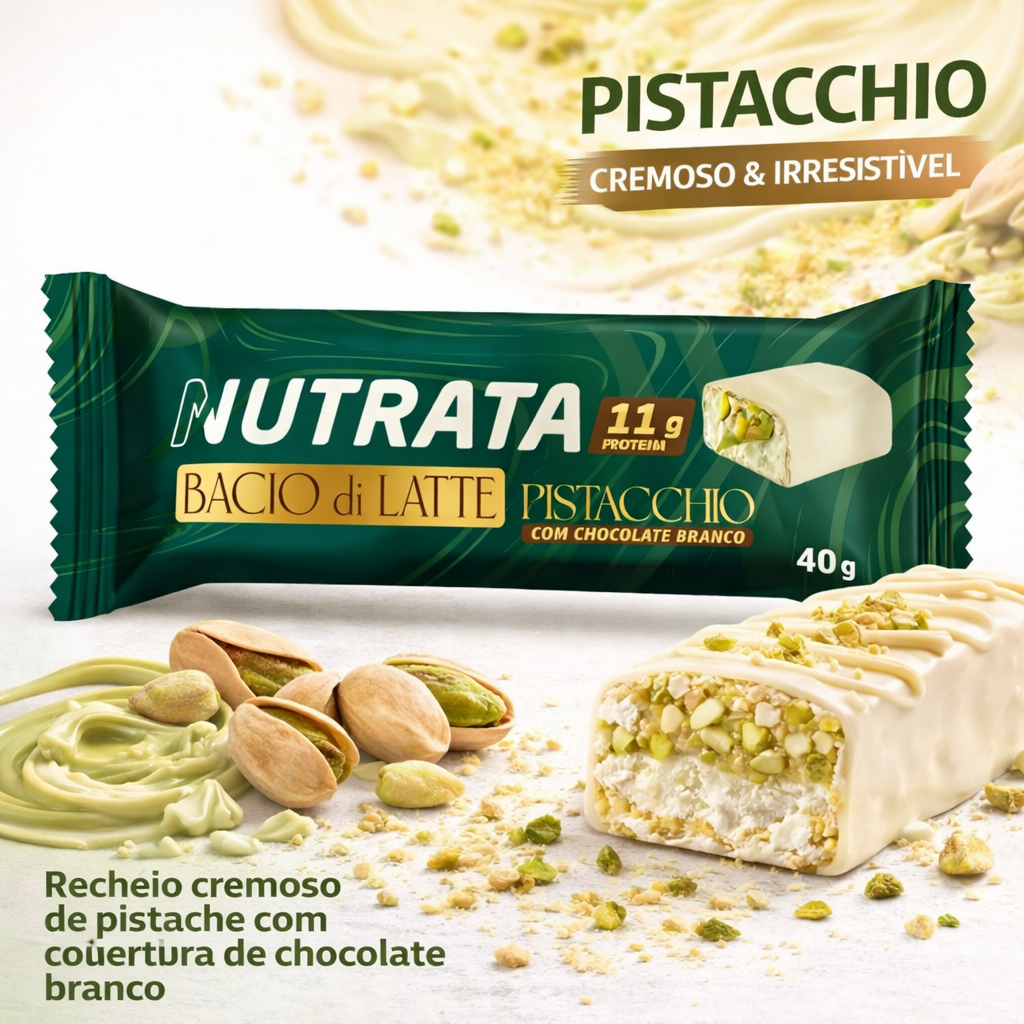 Pistache com Chocolate Branco: Cobertura sabor chocolate branco (gordura vegetal, soro de leite em pó, leite em pó integral, edulcorantes maltitol e sucralose. emulsificante lecitina de soja, conservante sorbato de potássio e aromatizante), recheio sabor pistache (gordura vegetal, soro de de leite em em pó, pó, leite em pó desnatado, leite em em pó integral, pasta de pistache, edulcorante maltitol, emulsificante lecitina de soja e aromatizante), colágeno hidrolisado. proteína de soro do leite concentrada, caseinato de cálcio, proteína concentrada de leite obtida de leite bovino, gordura de palma, pistache, frutooligossacarídeos (FOS), pasta de pistache, proteína de soro do leite isolada, polidextrose, iogurte em pó, edulcorantes xarope de sorbitol e xarope de maltitol, umectante glicerol, emulsificantes lecitina e goma acácia, aromatizantes, antiumectante fosfato tricálcico e antioxidante d-alfa-tocoferol. ALÉRGICOS: CONTÉM AVELÄS E DERIVADOS DE LEITE E SOJA. PODE CONTER AMENDOIM, AMÊNDOA, CASTANHA-DE-CAJU, CASTANHA-DO-BRASIL, NOZES, OVOS E PISTACHES. CONTÉM LACTOSE. NÃO CONTÉM GLÚTEN.