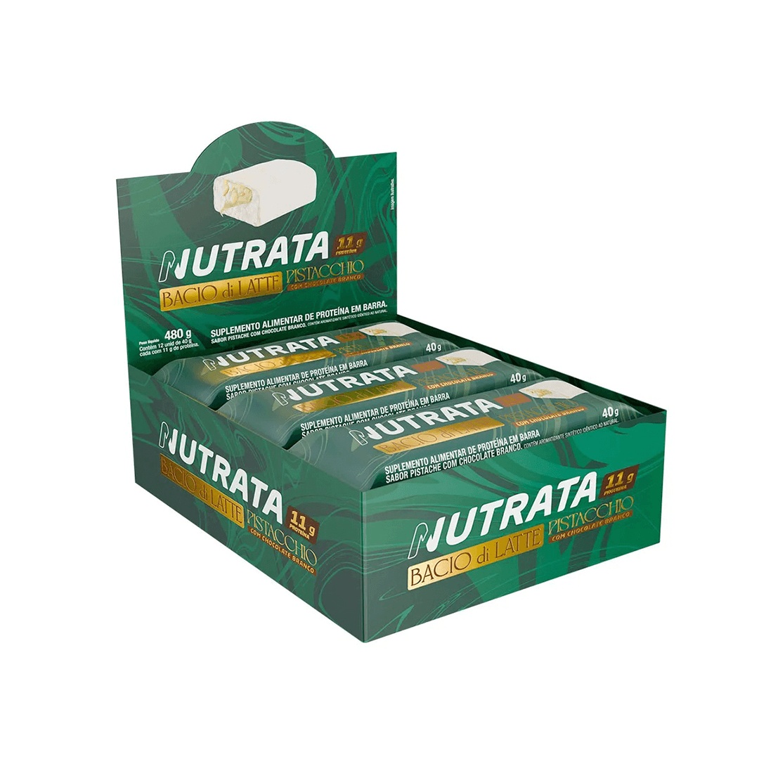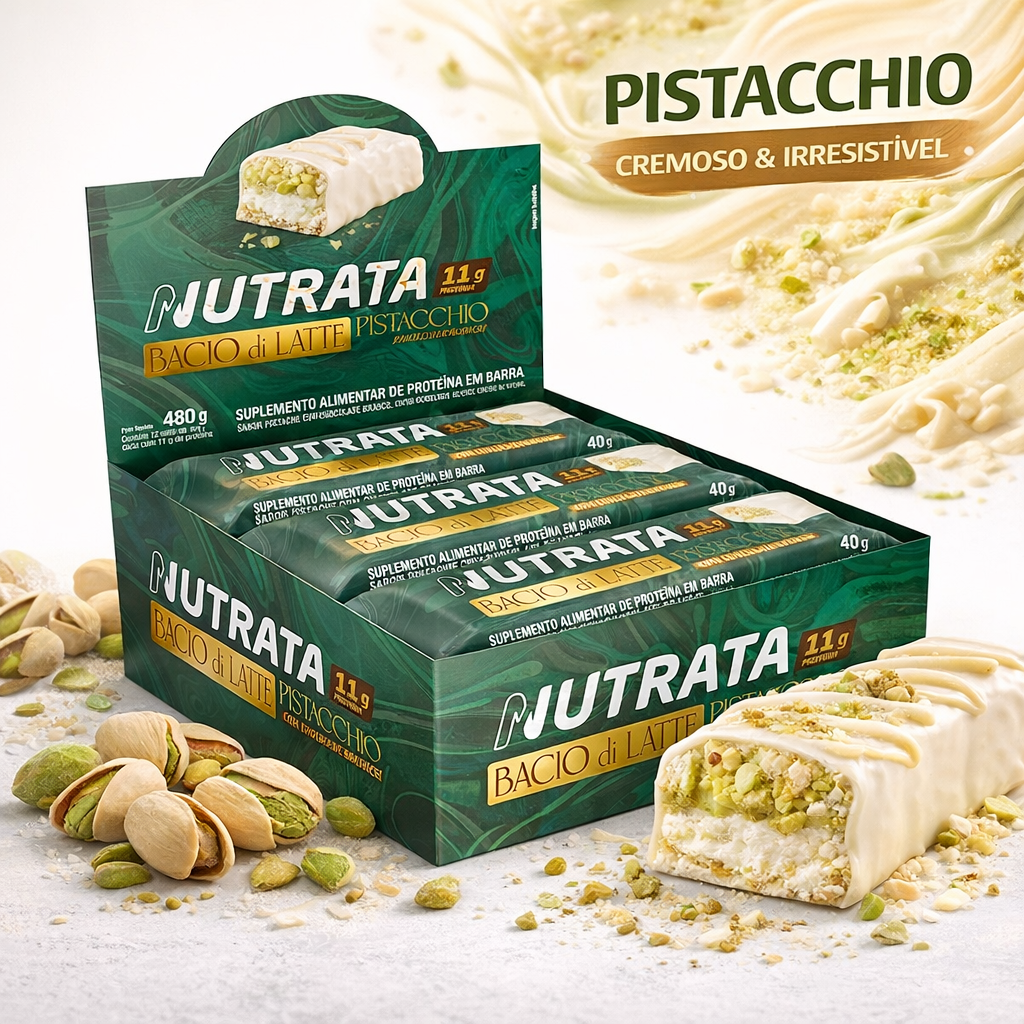 Barra de Proteína Nutrata Bacio Di Latte – Pistache e Chocolate Branco (40g).