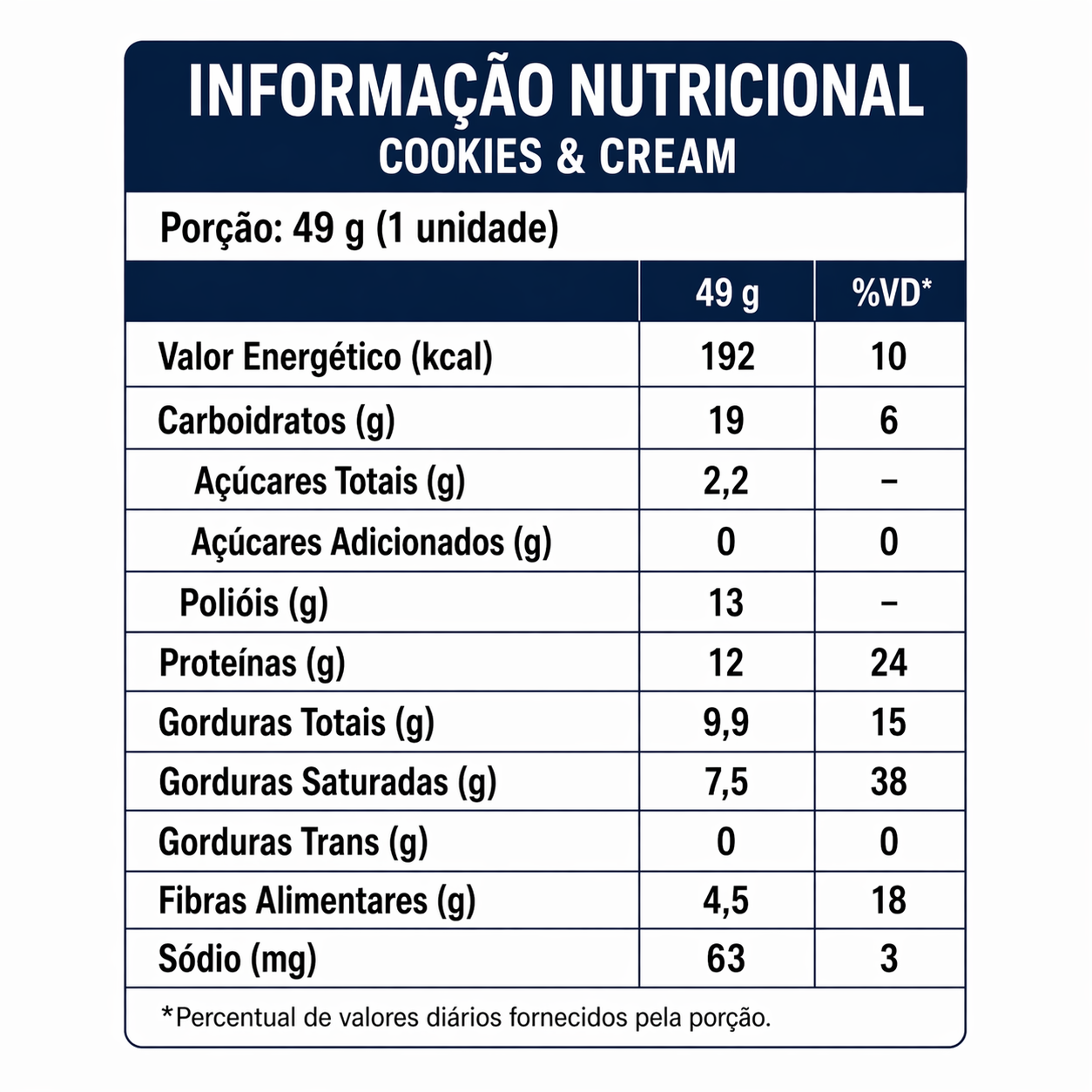 FÓRMULA BEST WHEY BLEND [Caseinato de Cálcio, Caseína, Proteína Concentrada do Soro do Leite e Proteína Isolada do Soro do Leite], Cobertura Proteica de Chocolate Zero Açúcar, Recheio de Chocolate Zero Açúcar, Óleos Vegetais (Girassol e Palma), Biscoito de Cacau em Pedaços Sem Glúten, Péptidos de Colágeno Hidrolisado, Polidextrose, Flocos de Arroz Crocante, Cloreto de Sódio, Umectante Glicerina Vegetal, Emulsificante Lecitina de Soja, Aromatizantes, Conservador Sorbato de Potássio e Edulcorante Natural Maltitol e Artificial Sucralose. "NÃO CONTÉM GLÚTEN." ALÉRGICOS: CONTÉM DERIVADOS DE LEITE E SOJA. PODE CONTER AMENDOIM, AMÊNDOA, AVELÃ, AVEIA SEM GLÚTEN, CASTANHA-DE-CAJU, CASTANHA-DO-PARÁ, GERGELIM, MACADÂMIA, NOZES E OVO. CONTÉM LACTOSE.