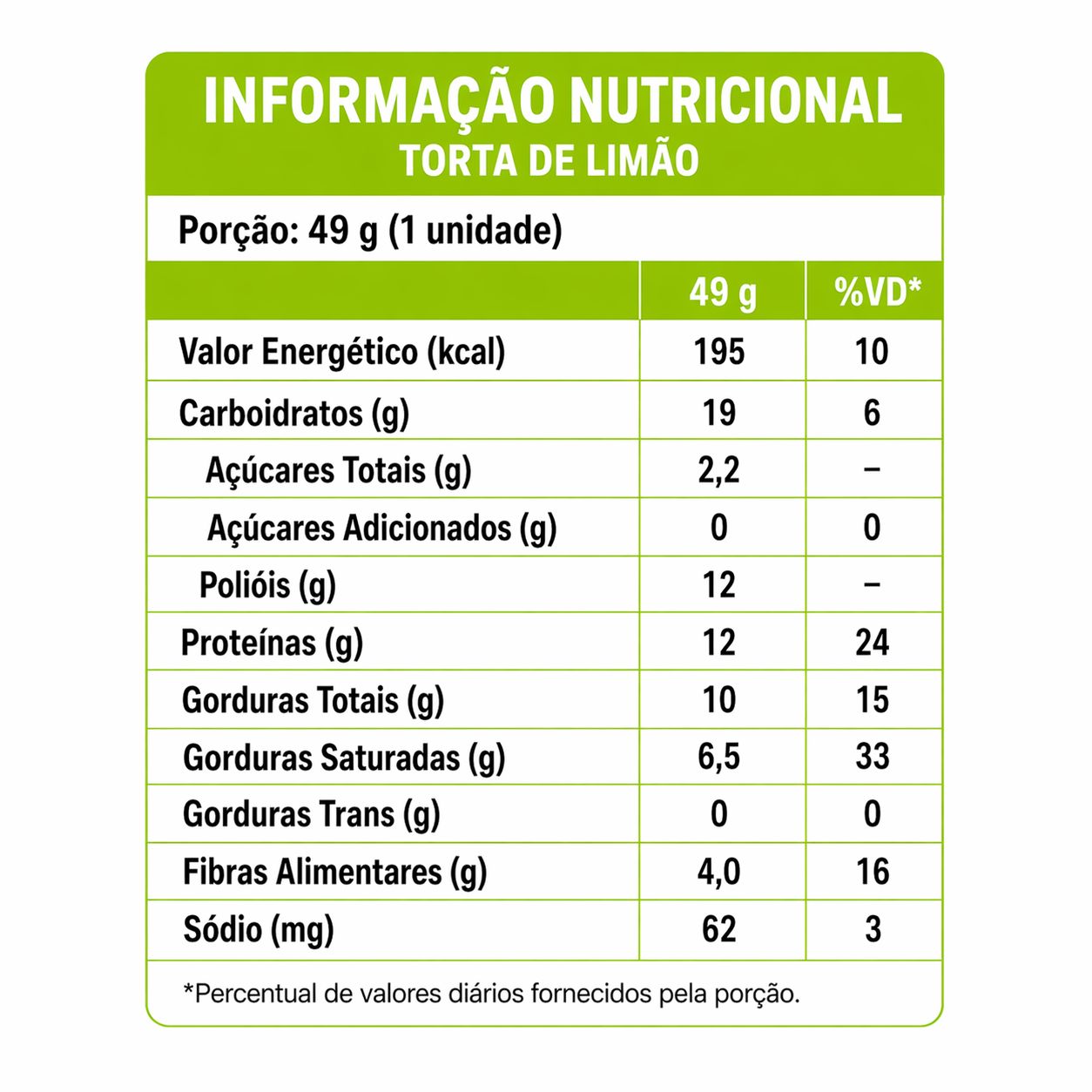 Torta de Limão: FORMULA BEST WHEY BLEND (Caseinato de Cálcio, Caseína, Proteína Concentrada do Soro do Leite e Proteína Isolada do Soro do Leite), Cobertura Protéica de Sabor logurte Zero Açúcar, Recheio de Leite Condensado Zero Açúcar, Óleos Vegetais (Girassol e Palma), Peptídeos de Colágeno Hidrolisado, Cristais de Caramelo Crocante Zero Açúcar (Maltitol e Polidextrose), Polidextrose, Flocos de Arroz Crocante, Polpa de Limão. Cloreto de Sódio, Umectante Glicerina Vegetal, Emulsificante Lecitina de Soja, Aromatizantes, Acidulante Acido Cítrico, Conservador Sorbato de Potássio e Edulcorante Natural Maltitol e Artificial Sucralose. "ALÉRGICOS: CONTÉM DERIVADOS DE LEITE E SOJA. PODE CONTER AMENDOIM, AMÉNDOA, AVELĀS, AVEIA SEM GLÚTEN, CASTANHA-DE-CAJU, CASTANHA-DO-PARÁ, GERGELIM, MACADAMIA, NOZES E OVO." "NÃO CONTÉM GLÚTEN." "CONTÉM LACTOSE."
