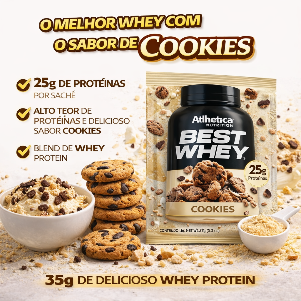Se você busca o equilíbrio perfeito entre nutrição e prazer, o Best Whey Dose Única (35g) sabor Cookies & Cream é a escolha certa. A Atlhetica Nutrition conseguiu reproduzir o sabor clássico do sorvete de baunilha com pedacinhos de biscoito de chocolate, transformando seu shake em uma verdadeira sobremesa fitness.