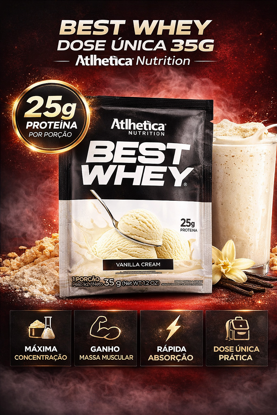 O Best Whey Dose Única 35g Vanilla Cream da Atlhetica Nutrition é a combinação perfeita entre sabor premium e alta performance nutricional. Com 25g de proteína por porção, é ideal para quem busca ganho de massa muscular, recuperação eficiente e praticidade no dia a dia.