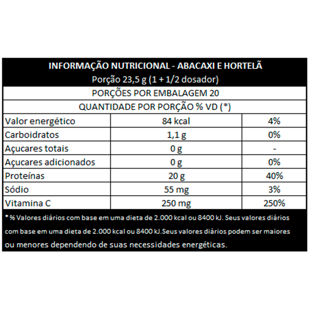 Abacaxi com Hortelã: Colágeno hidrolisado, ácido ascórbico (vitamina C), hortelã em pó liofilizada aromatizantes naturais acidulante ácido cítrico e edulcorantes glicosídeos de esteviol de Steve rebaudiana Bertoni e taumatina.