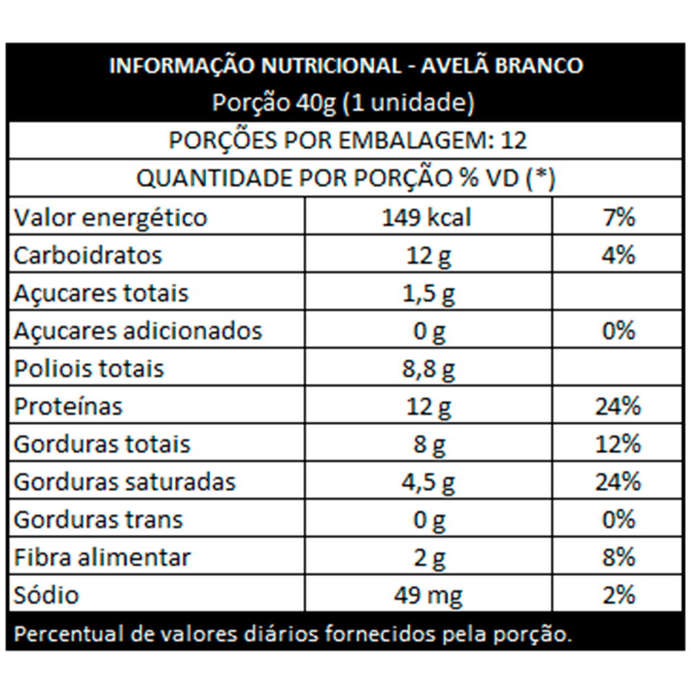 Avelã branco: Blend protéico (caseinato de cálcio, proteína concentrada do leite, proteína de soro do leite concentrada, colágeno hidrolisado), cobertura de chocolate ao leite diet (gordura vegetal, proteína de soro do leite concentrada, leite em pó desnatado, cacau em pó, emulsificante INS 476), ganache de avelã branco diet (gordura vegetal, proteína de soro do leite concentrada, pasta de avelã torrada, caseinato de cálcio, Polidextrose), gordura de palma, Polidextrose, avelã granulada, cloreto de sódio, aromatizante idêntico ao natural, edulcorantes INS 9651 e INS 960a, umectante INS 422, emulsificante INS 322i, conservante INS 202 e antioxidante 307b. ALÉRGICOS: CONTÉM AVELA E DERIVADOS DE LEITE E SOJA. PODE CONTER AMENDOIM, CASTANHA-DE-CAJU, CASTANHA-DO-PARÁ E NOZES. CONTÉM LACTOSE. NÃO CONTÉM GLÚTEN.