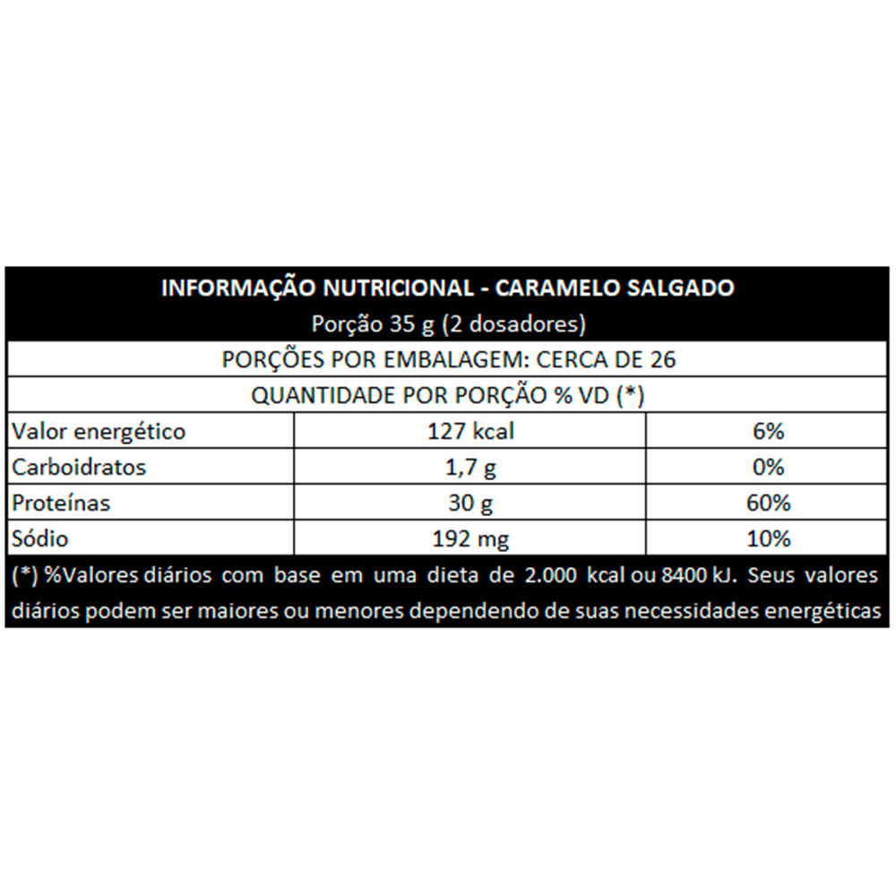 Caramelo Salgado: ProMyoblend (colágeno hidrolisado e proteína de origem bovina), cloreto de potássio, cloreto de sódio, aromatizantes, espessante goma xantana, edulcorante sucralose e corantes ponceau 4R, tartrazina e azul brilhante FCF. ALÉRGICOS: CONTÉM DERIVADOS DE SOJA. NÃO CONTÉM GLÚTEN. NÃO CONTÉM LACTOSE. "Ingrediente utilizado no processo de fabricação da proteína com função de instantaneização.