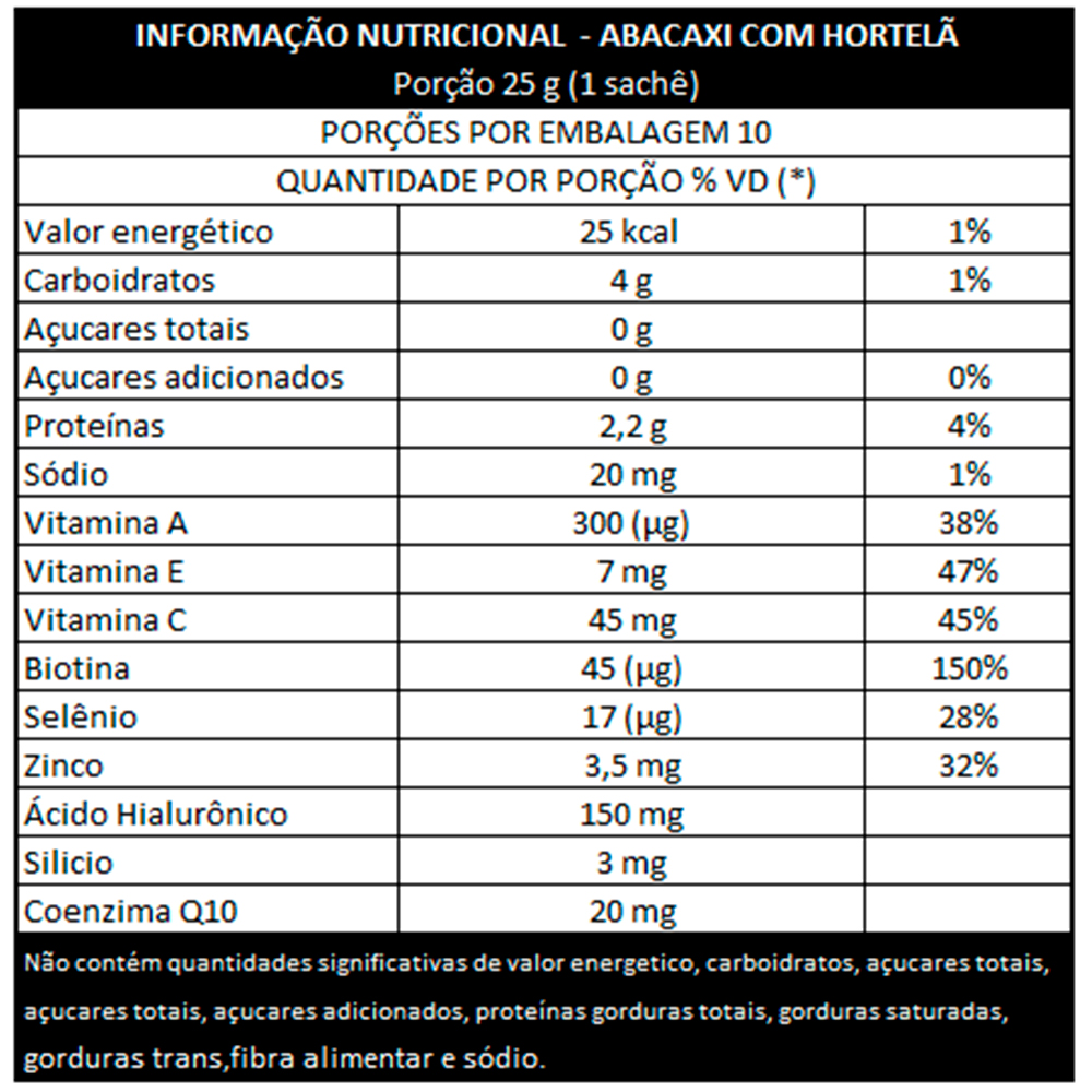 Abacaxi com Hortelã: Colágeno Hidrolisado, Peptídeos Bioativo de Colágeno Hidrolisado com peso molecular média 2kDa®, Ácido Hialurônico (Hialuronato de Sódio), Vitamina C (Ácido Ascórbico), Coenzima Q10, Vitamina E (Acetato de DL-alfa-tocoferol), Zinco (Sulfato de Zinco Monohidratado), Silício (Ácido ortosilícico estabilizado em cloreto de colina), Vitamina A (Acetato de Retinol), Biotina (D-Biotina), Selênio (Selenito de Sódio), Aroma Sintético Idêntico ao Natural de Abacaxi com Hortelã, Acidulante Ácido Cítrico, Edulcorante Glicosídeos de esteviol (Stévia Rebaudina), Antiumectante Dióxido de Silício e Corante Natural Clorofila. NÃO CONTÉM GLÚTEN. NÃO CONTÉM LACTOSE. ALÉRGICOS: PODE CONTER DERIVADOS DO LEITE E SOJA*. *Produzido em equipamento onde se processam estes alimentos, contudo, ações preventivas de limpeza são adotadas para evitar essa ocorrência.