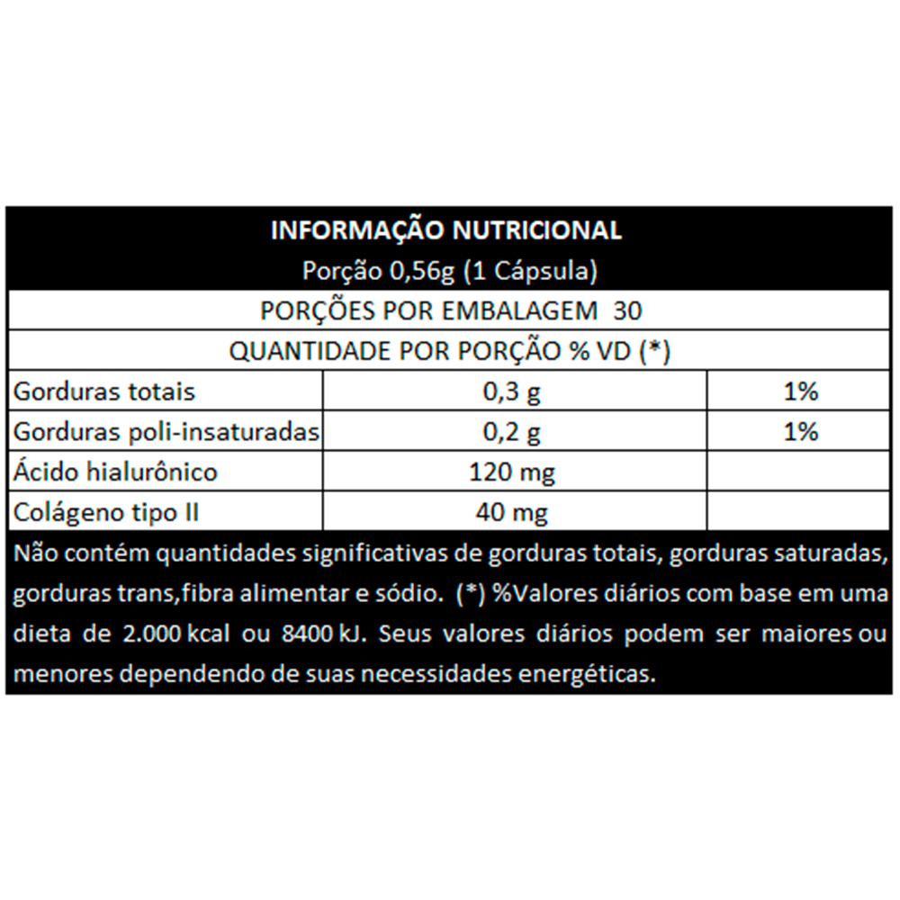Ácido Hialuronico (Hialuronato de Sódio obtido pela fermentação de streptococcus zooepidemicus), Colágeno tipo II (colágeno de frango com colágeno tipo Il não desnaturado) e triglicerídeos de cadela média (TCM). INGREDIENTES DA CÁPSULA: Gelatina, água purificada umectante glicerina e corante dióxido de titânio. NÃO CONTÊM GLÚTEN.