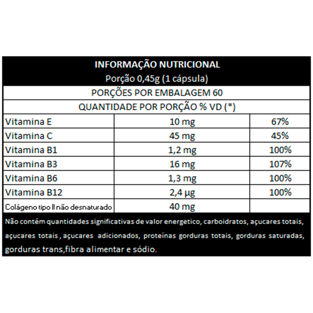 Mix de vitaminas (vitamina C (ácido ascórbico), vitamina E (acetato de tocoferol vitamina B3 (nicotinamida), vitamina B6 (cloridrato de piridoxina), vitamina B1 (cloridrato de tiamina) vitamina B12 (cianocobalamina), estabilizante celulose microcristalina e antiumectante dióxido de silício e colágeno de frango tipo não desnaturado, Cápsula: geleificante gelatina, umectante glicerina e corante dióxido de titânio. NÃO CONTÉM GLÚTEN.
