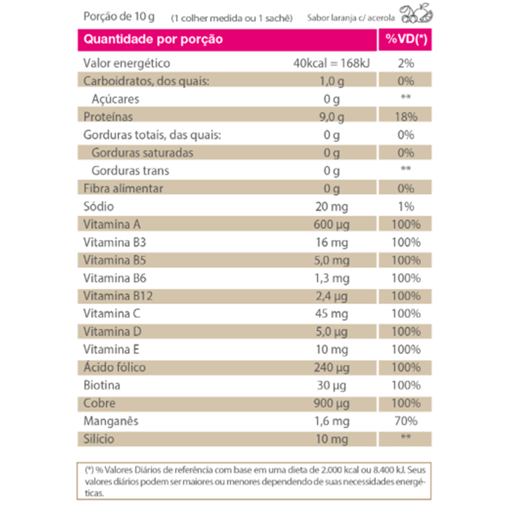 Laranja Com acerola: Peptídeo de colágeno, premix de vitaminas e minerais [ácido ascórbico (vitamina C), niacinamida (vitamina B3), acetato de DL-alfa-tocoferol (vitamina E), D-pantotenato de cálcio (vitamina B5), sulfato de manganês (manganês), cloridrato de piridoxina (vitamina B6), sulfato cúprico (cobre), acetato de retinol (vitamina A), ácido fólico (vitamina B9), D-biotina (vitamina B7), colecalciferol (vitamina D) e cianocobalamina (vitamina B12)], ácido ortosilícico estabilizado em cloreto de colina (silício), acidulante ácido cítrico, aroma idêntico ao natural, espessante goma xantana, corantes naturais urucum, carmim e cúrcuma, edulcorantes glicosídeos de esteviol (estévia) e taumatina e antiumectante dióxido de silício.NÃO CONTÉM GLÚTEN.