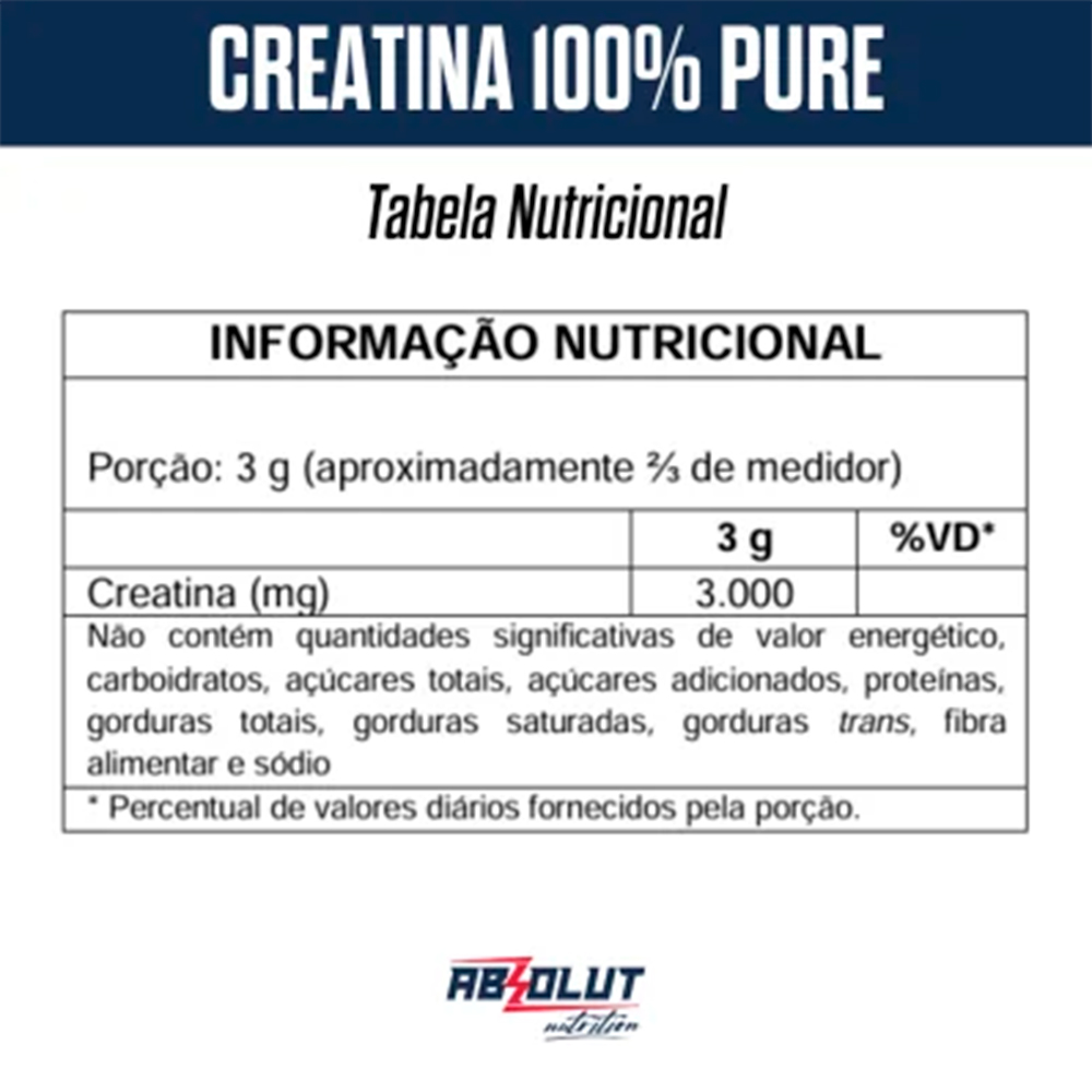 2. Como devo tomar a Creatina 100% Pura Absolut Nutrition? O modo de uso padrão é de 3g a 5g por dia, misturados em água ou sua bebida favorita (suco, shake de proteína). É recomendado o uso contínuo, todos os dias (inclusive nos dias de descanso), para manter os estoques musculares sempre saturados.