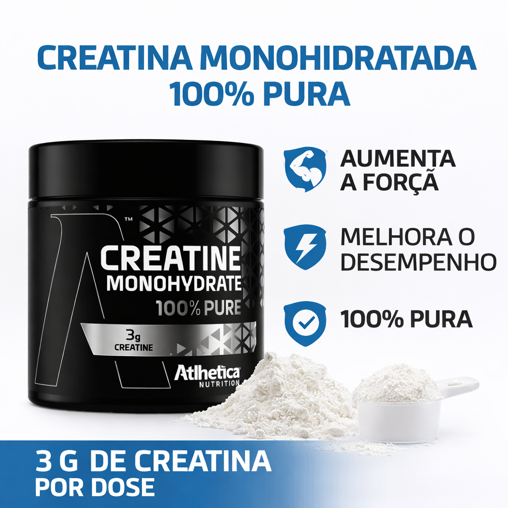 A Creatina Monohidratada Atlhetica Nutrition possui fórmula pura, sem adição de açúcares ou outros ingredientes desnecessários, oferecendo praticidade e eficiência para quem deseja potencializar os resultados na academia ou em outras modalidades esportivas.