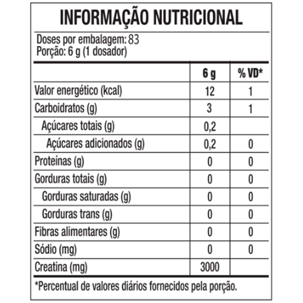 Creatina Monohidratada e maltodextrina. PODE CONTER LEITE, OVO, AMENDOIM, SOJA, TRIGO E DERIVADOS. NÃO CONTÉM LACTOSE. NÃO CONTÉM GLÚTEN.