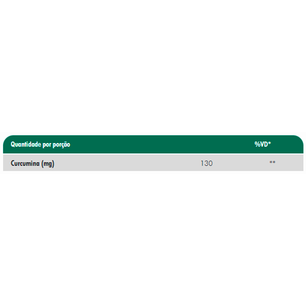 Extrato de rizomas de cúrcuma longa, agente de massa celulose microcristalina e lubrificante estearato de magnésio. Cápsula: estabilizante hidroxipropilmetilcelulose e glaceantes carragena e acetato de potássio. NÃO CONTÉM GLÚTEN.