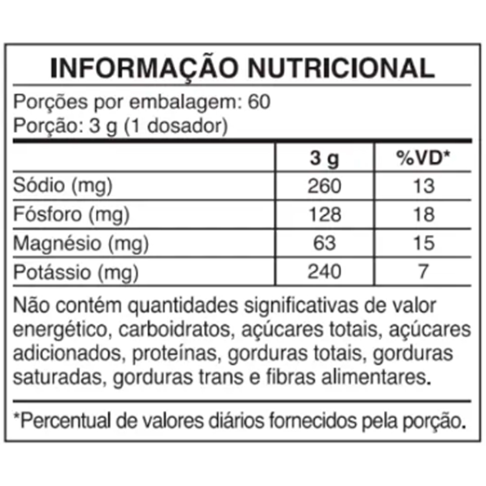 Fosfato de potássio monobásico, citrato de potássio, magnésio citrato malato, citrato de sódio, cloreto de sódio, acidulante ácido cítrico, aromatizante idêntico ao natural, antiumectante dióxido de silício e edulcorante glicosídeos de esteviol de Stévia rebaudiana Bertoni. NÃO CONTÉM GLÚTEN.