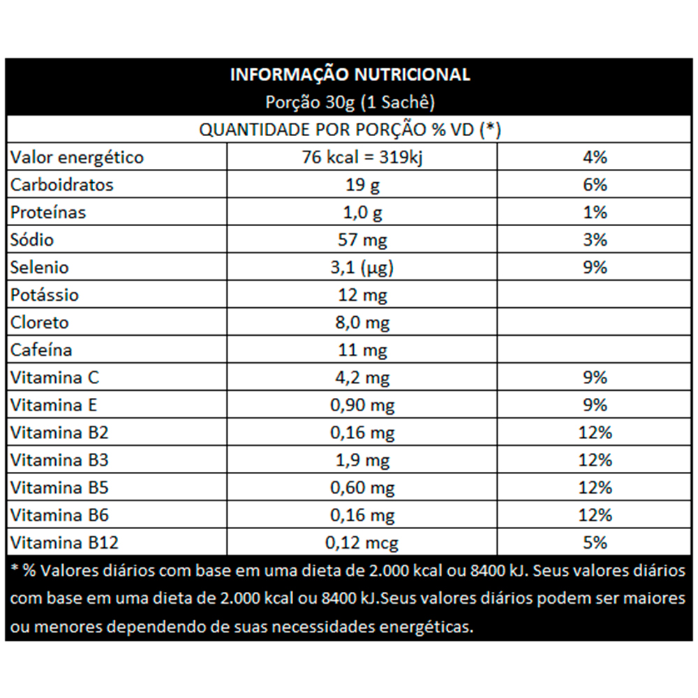 Guaraná com Açaí: Maltodextrina, Água Filtrada por Osmose Reversa, Dextrose, Frutose, Isomaltulose (Palatinose), Proteína de Soro do Leite Concentrada (WPC), D-Ribose, Waxy Maize, Proteína de Soro do Leite Isolada (WPI), Taurina (100 mg/30 g), Sódio (Citrato de Sódio Di-Hidratado), Cafeína (11 mg/30g) Glucoronolactona (7,4 mg/30 g), Inositol (6,2 mg/30 g), Potássio (Citrato de Potássio Tribasico Monohidratado), Cloreto (Cloreto de Sódio), Vitamina 83 (Nicotinamida), Vitamina C (Acido Ascórbico), Vitamina B5 (Pantotenato de Cálcio), Vitamina E (dl-alfa Acetato de Tocoferol), Vitamina B2 (Riboflavina), Vitamina B6 (Piridoxina), Selênio (Selenito de Sódio), Vitamina B12 (Cianocobalamina), Acidulante Acido Cítrico, Aroma Sintético Idêntico ao Natural de Guaraná com Açaí, Regulador de Acidez Acido Fosfórico e Conservante Sorbato de Potássio, NÃO CONTEM GLUTEN.CONTEM LACTOSE. ALERGICOS: CONTEM DERIVADOS DO LEITE.
