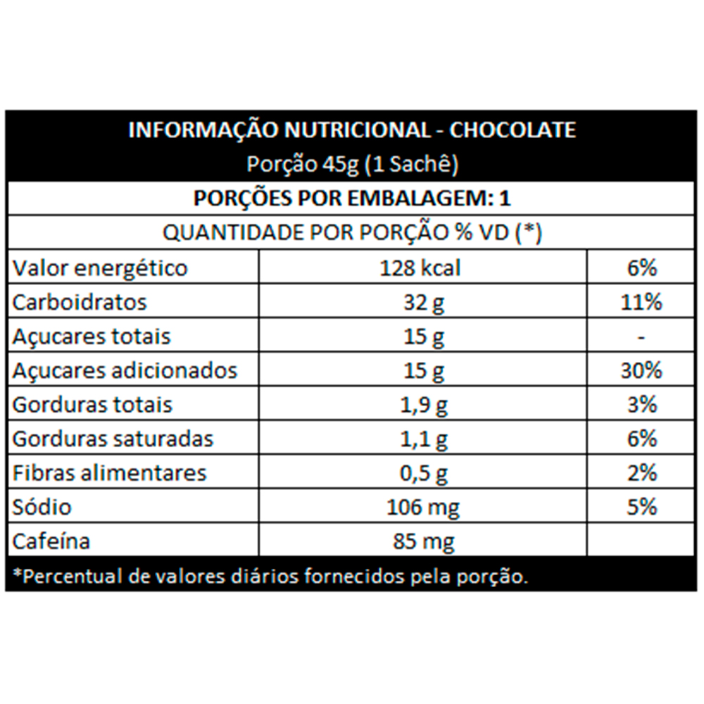 Chocolate: Maltodextrina, D-Frutose, água, liquor de cacau, cafeína, cloreto de sódio, estabilizante citrato trissódico, conservantes benzoato de sódio e sorbato de potássio, emulsificante lecitina, aromatizante e edulcorante sucralose. ALÉRGICOS: CONTÉM DERIVADOS DE SOJA. NÃO CONTÉM GLÚTEN