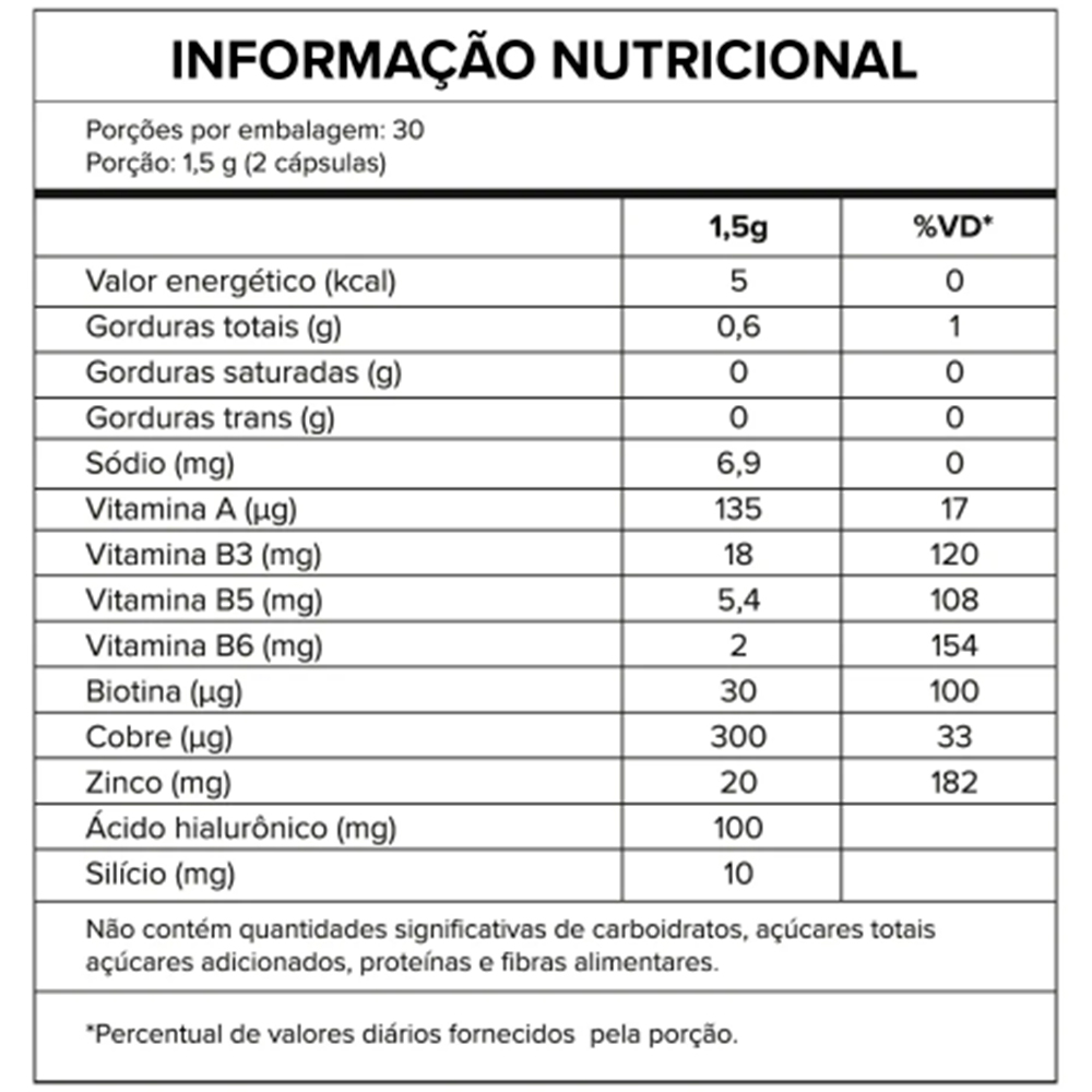 ÓLEO DE SEMENTE DE UVA (VITIS VINIFERA L.), HIALURONATO DE SÓDIO OBTIDO PELA FERMENTAÇÃO DE STREPTOCOCCUS ZOOPIDEMICUS, BISGLICINATO DE ZINCO (ZINCO), NIACINAMIDA (VITAMINA B3), ÁCIDO ORTOSILÍCICO ESTABILIZADO EM OLORETO DE COLINA, D-PANTOTENATO DE CALCIO (VITAMINA B5), CLORIDRATO DE PIRI- DOXINA (VITAMINA B6), BISGLICINATO DE COBRE (COBRE), BETACAROTENO (VITAMINA A), ACETATO DE RETINOL (VITAMINA A), BIOTINA (VITAMINA B7) E ANTIUMECTANTE DIÓXIDO DE SILICIO. COMPOSIÇÃO DA CÁPSULA: GELATINA, ÁGUA E UMECTANTE GLICERINA. ALERGICOS: CONTÉM DERIVADOS DE SOJA. NÃO CONTÉM GLÚTEN