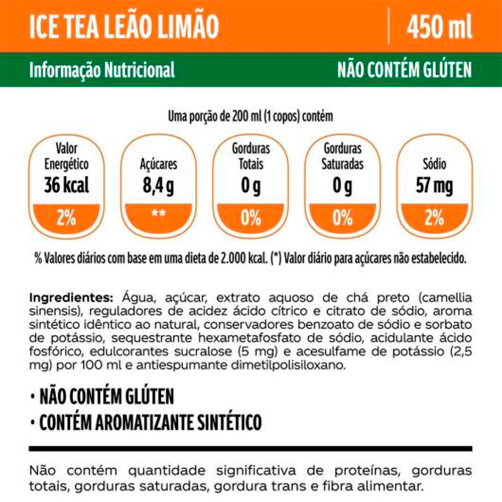 Limão: Água, açúcar, extrato aquoso de chá preto (camellia sinensis), reguladores de acidez ácido cítrico e citrato de sódio, aroma sintético idêntico ao natural, conservadores benzoato de sódio e sorbato de potássio, sequestrante hexametafosfato de sódio, acidulante ácido fosfórico, edulcorantes sucralose (5,0mg) e acesulfame de potássio (2,5mg) por 100ml e antiespumante dimetilpolisiloxano.