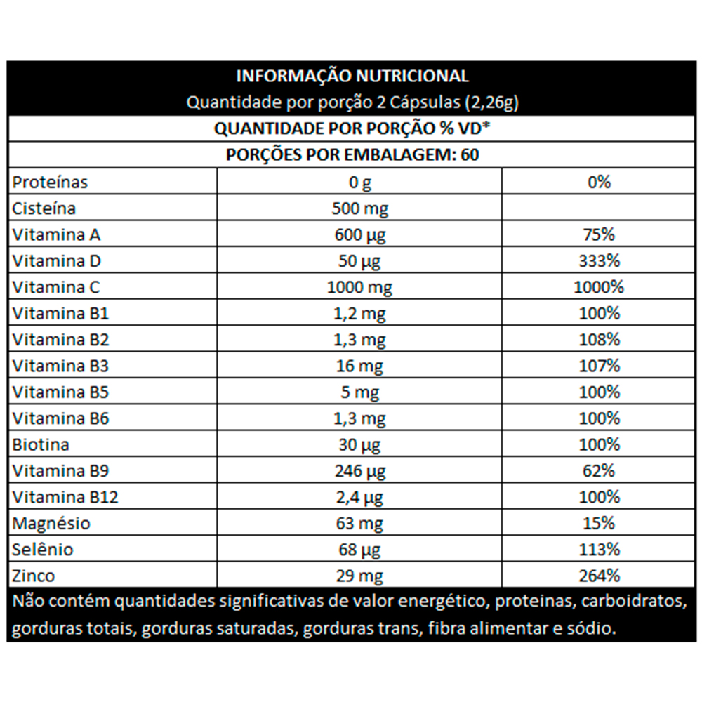 ÁCIDO ASCORBICO (MITAMINA C), N-ACETIL L-CISTEÍNA, BISGLICINATO DE MAGNÉSIO (MAG- NESIO), BISGLICINATO DE ZINCO (ZINCO), LEVEDURA ENRIQUECIDA COM SELENIO (SELÊNIO), COLECALCIFEROL (MITAMINA DI, NIACINAMIDA (VITAMINA B3), D-PANTOTENATO DE CALCIO (VITAMINA B5), ACETATO DE RETINOL MTAMINA A), CLORIDRATO DE PIRIDOXINA (MITAMINA B6), RIBOFLAVINA (VITAMINA B2), CLORIDRATO DE TIA MINA MITAMINA B1), ÁCIDO FÓLICO (VITAMINA B9), METILCOBALAMINA COBALAMINA (VITAMINA B12), D-BIOTINA MITAMINA B7) E ANTIUMECTANTES ESTEARATO DE MAGNÉSIO E DIÓXIDO DE SILÍCIO. COMPOSIÇÃO DA CÁPSULA: HIDRO- XIPROPILMETILCELULOSE (HPMC), ÁGUA PURIFICADA, OPACIFICADOR (CORANTE CARBONATO DE CALCIO E AMIDO MODIFICADO), GELIFICANTE CARRAGENA E REGULADOR DE ACIDEZ ACETATO DE POTÁSSIO. NÃO CONTÉM GLÚTEN.