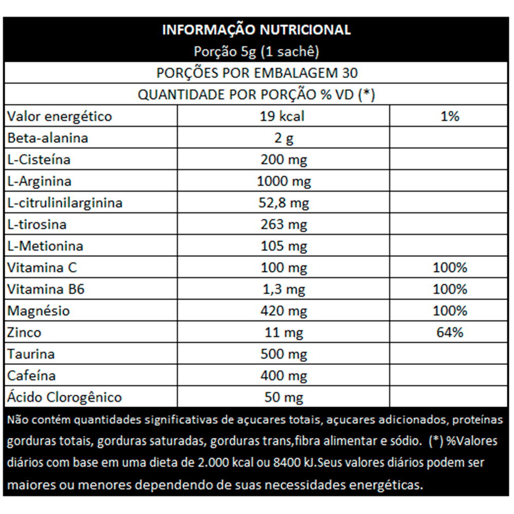 Frutas Vermelhas: Beta-Alanina, L-Arginina, Bisglicinato de Magnésio, Alga Chondrus Crispus Invernal (L-Citrulinilarginina), Taurina, Extrato de Café Verde, Cafeína, L-Tirosina, L-Cisteina, N-Acetil-L-Metionina, Extrato de Semente de Uva, Ácido Ascórbico, Zinco Aspartato, Vitamina B6 (Cloridrato de Piridoxina), Acidulante Ácido Cítrico, Aroma Idêntico ao Natural de Frutas Vermelhas, Corante Vermelho Beterraba e Edulcorante Sucralose. ALÉRGICOS: PODE CONTER AMENDOIM, LEITE, SOJA E OVO. NÃO CONTÉM GLÚTEN. CONTÉM LACTOSE.