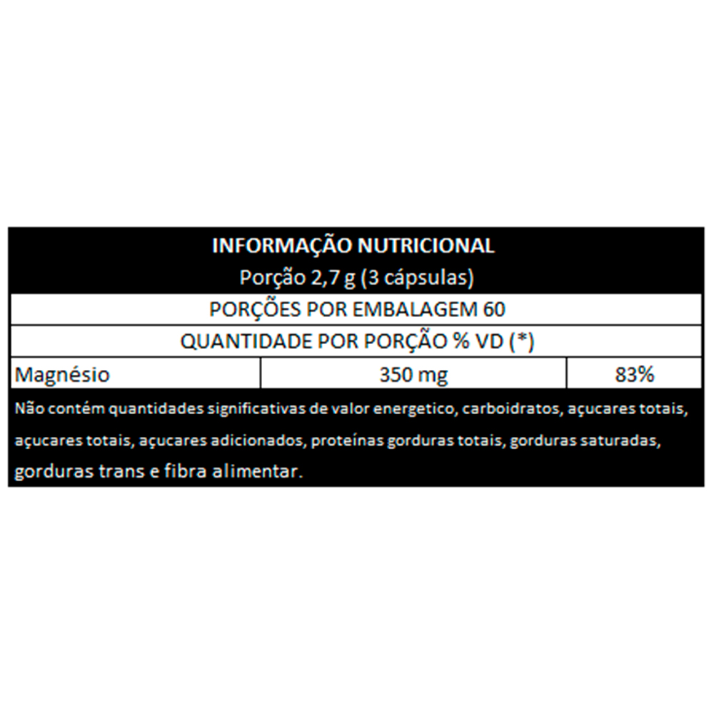 Bisglicinato de magnésio, Dimagnésio Malato, taurato de magnésio e sais de magnésio do ácido cítrico. Cápsula: água purificada e espessante hidroxipropilmetilcelulose. NÃO CONTÉM GLÚTEN.