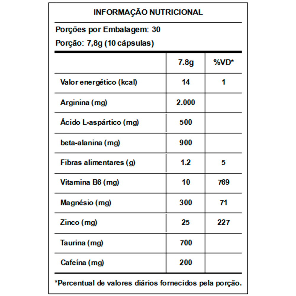 L-arginina, lubrificante estearato de magnésio e geleificante gelatina, beta-alanina estabilizante celulose microcristalina, lubrificante estearato de magnésio, antiumectante dióxido de silício e corantes vermelho 40 e dióxido de titânio, cafeína, estabilizante hidroxipropilmetilcelulose, glaceantes carragena e acetato de potássio e corante clorofilina cúprica. Taurina, corantes dióxido de titânio, ponceau 4r, azul brilhante fcf, carmosina e amarelo crepúsculo. Oxido de magnésio, acido l-aspártico, bisglicinato de zinco, cloridrato de piridoxina. NÃO CONTÉM GLÚTEN.