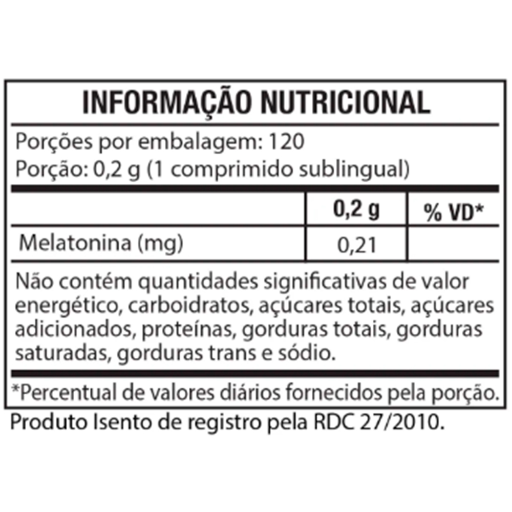 Melatonina, estabilizantes celulose microcristalina e povidone, lubrificante estearato de magnésio, antiumectante dióxido de silício e edulcorante sucralose. NÃO CONTÉM LACTOSE. NÃO CONTÉM GLÚTEN.