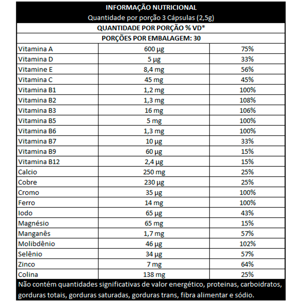 Cálcio (Fosfato de Cálcio Tribasico e Fosfato de Cálcio Dibásico, Colina (Bitartarato de Colina), Magnésio (Sulfato de Magnésio Monohidratado) vitamina C (Acido Ascórbico), Vitamina B3 (Nicotinamida), Ferro (bisglicinato de ferro Vitamina E (DL. Alfa Acetato de Tocoferol), Zinco (Sulfato de Zinco Monohidratado Vitamina B5 (Pantotenato de Cálcio), Manganês (Sulfato de Manganês Monohidratada, Vitamina B2 (Riboflavina), Vitamina B6 (Cloridrato de Piridoxina), Vitamina B1 (Nitrato de Tiamina), Vitamina A (Palmitato de Retinol). Cobre (Sulfato de Indo), lodo (Iodeto de Potássio), Vitamina B9 (Ácido pteroilmonoglutamico), molibdênio (Molibdato de Sódio Dihidratado), Cromo (Picolinato de Cromo), Selênio (Selenito de Sódio), Vitamina B7 (D-Biotina), Vitamina D (Colecalciferol), Vitamina B12 (Cianocobalamina) e Antiumectante Dióxido de Silício. INGREDIENTES DA CAPSULA: HPMC (hidroxipropilmetilcelulose), Água purificada e Corante Dióxido de Titânio. NÃO CONTÉM GLÚTEN.