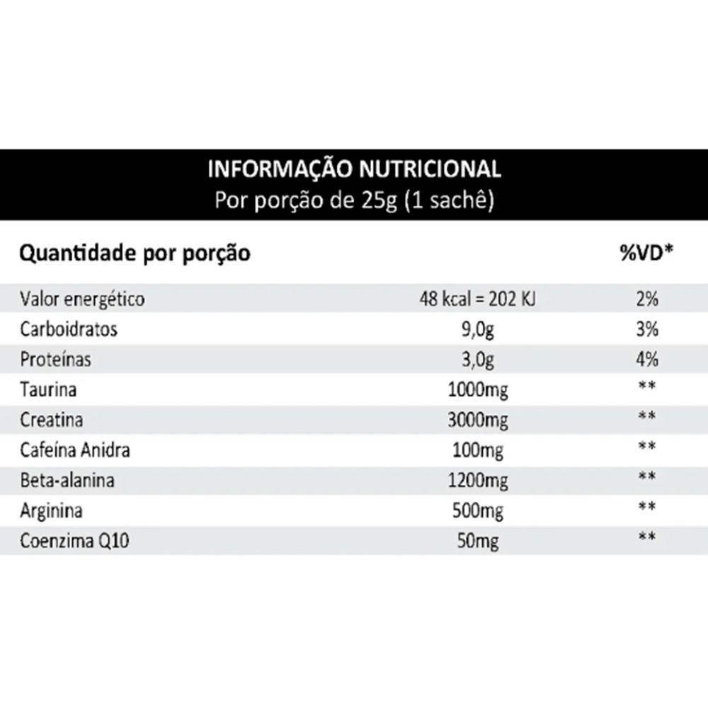 Isomaltulose, Água Filtrada por Osmose Reversa, Creatina Monohidratada, Beta- Alanina, Taurina, Arginina (Cloridrato de L-Arginina), Cafeína Anidra, Coenzima Q10, Pimenta vermelha (Capsicum Annum), Aroma Sintético Idêntico ao Natural de Guaraná, Acidulante Ácido Cítrico, Edulcorante Sucralose, Conservadores Sorbato de Potássio e Benzoato de Sódio e Regulador de Acidez Ácido Fosfórico. ALÉRGICOS: PODE CONTER DERIVADOS DO LEITE*. *Produzido em equipamento onde se processam estes alimentos, contudo, ações preventivas de limpeza são adotadas para evitar essa ocorrência.