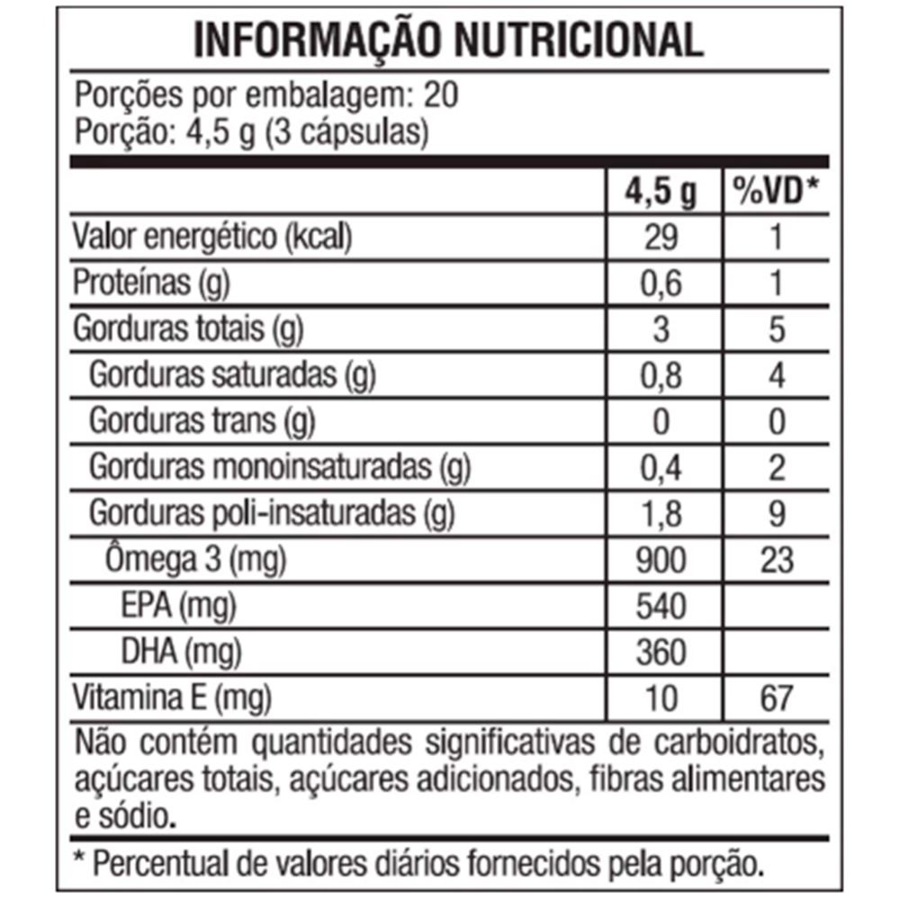 Óleo de peixe e acetato de DL-alfa-tocoferol (vitamina E). Composição da cápsula: gelatina, água e umectante glicerina. ALÉRGICOS: CONTÉM PEIXE E SOJA. NÃO CONTÉM GLÚTEN.