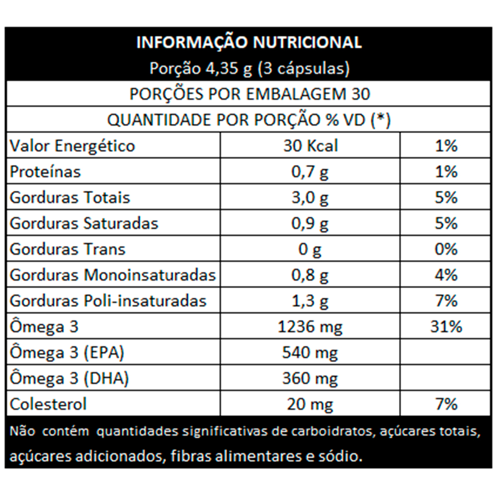 Óleo de peixe, água purificada, gelificante gelatina, umectante glicerol e antioxidante mistura concentrada de tocoferóis. CONTÉM GLÚTEN. ALERGICOS: CONTÉM DERIVADOS DE PEIXE E PODE CONTER SOJA LETE OVOS, AMENDOIM, AMENDOA, AVELĀS, CASTANHA-DE-CAJU CASTANHA-DO-PARA, MACADAMIAS, NOZES, PECĀS, PISTACHES, PINOL CASTANHAS, CRUSTACEOS (KRILL E CARANGUEJO), TRIGO, CENTED CEVADA AVEIA E SUAS ESTIRPES HIBRIDIZADAS E SEUS DERIVADOS.