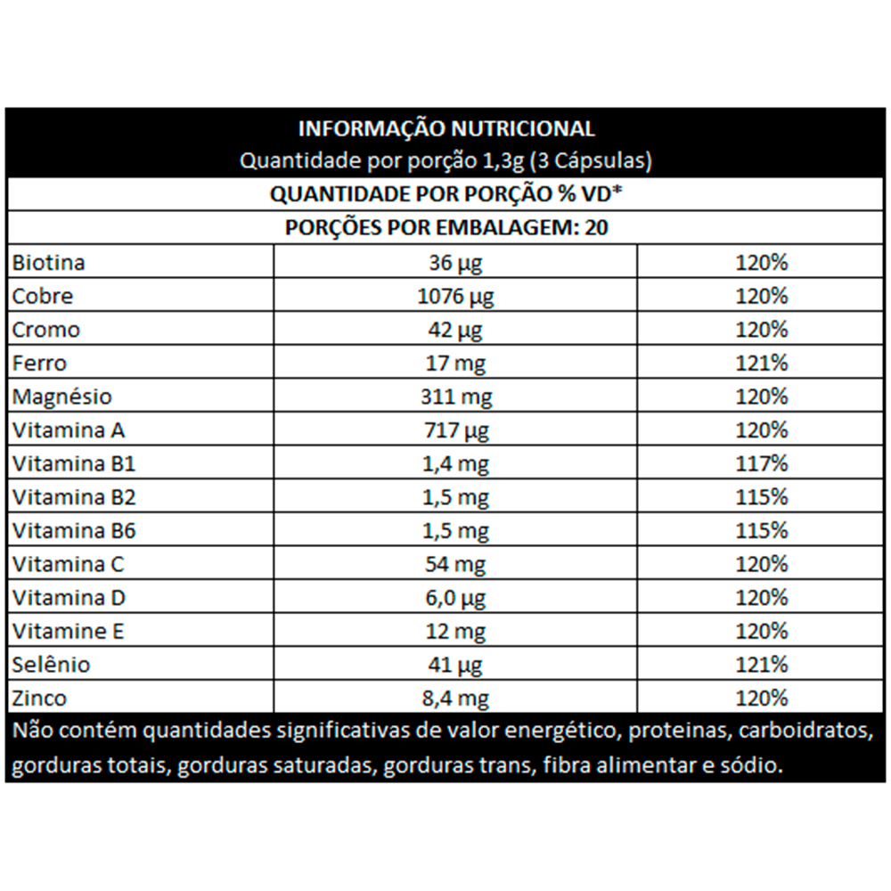 Oxido de magnésio (magnésio), ácido ascórbico (vitamina C), pirofosfato férrico (ferro), acetato de DL-alfa-tocoferol (vitamina E), sulfato de zinco (zinco), cloridrato de piridoxina (vitamina B6), riboflavina (vitamina B2), tiamina mononitrato (vitamina B1), sulfato cúprico (cobre), palmitato de retinol (vitamina A), Picolinato de cromo (cromo), selenometionina (selênio), D-biotina (biotina) e colecalciferol (vitamina D]). Antiumectantes celulose microcristalina e dióxido de silício, cápsula de gelatina (gelatina, corantes vermelho azorrubina, dióxido de titânio e azul brilhante e umectante água purificada).