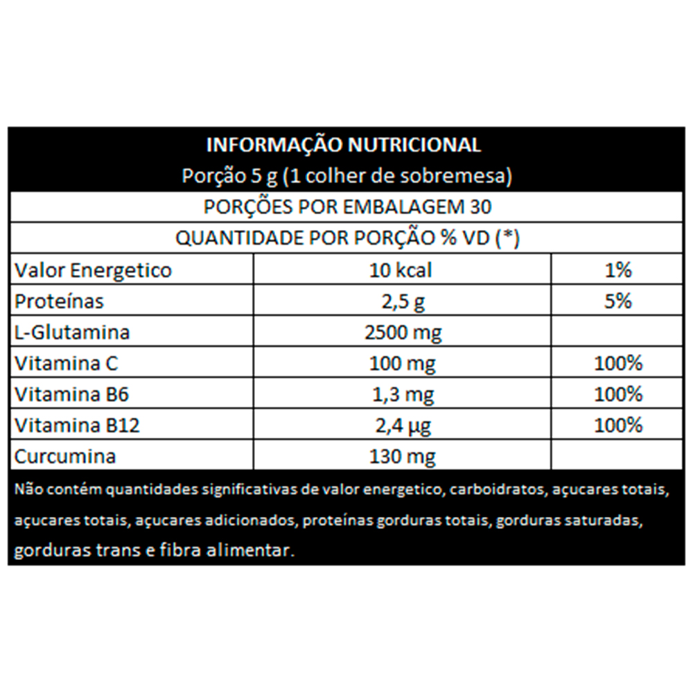 L-glutamina, polpa de camu-camu, gengibre, extrato de rizomas de cúrcuma longa, ácido ascórbico, pimenta preta, cloridrato de piridoxina, acetato de retinol, cianocobalamina, acidulante ácido cítrico e aroma sintético idêntico ao natural de limão. NÃO CONTÉM GLÚTEN
