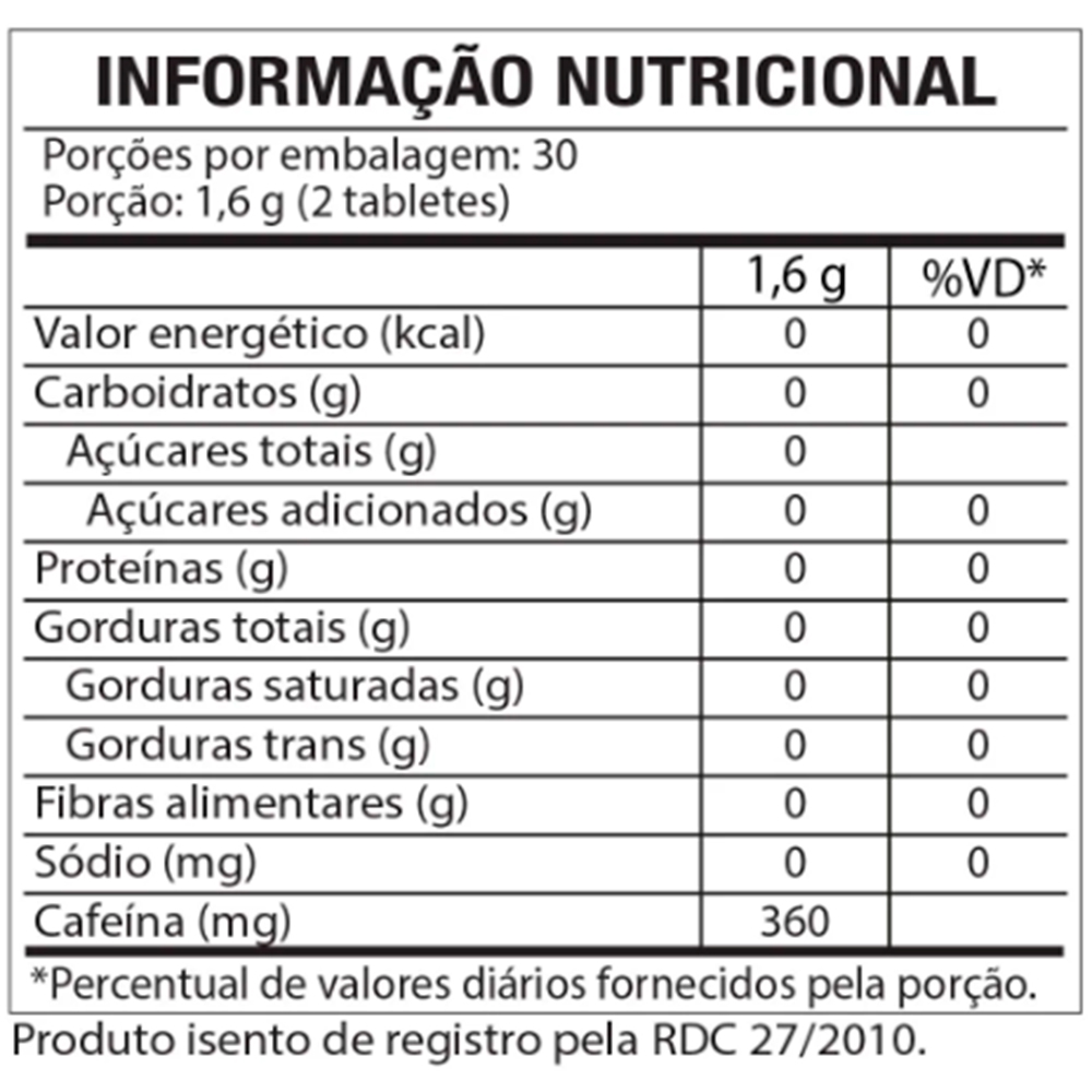 Cafeína anidra, Estabilizante celulose microcristalina, antiumectante dióxido de silício e lubrificante estearato de magnésio. NÃO CONTÉM GLÚTEN.