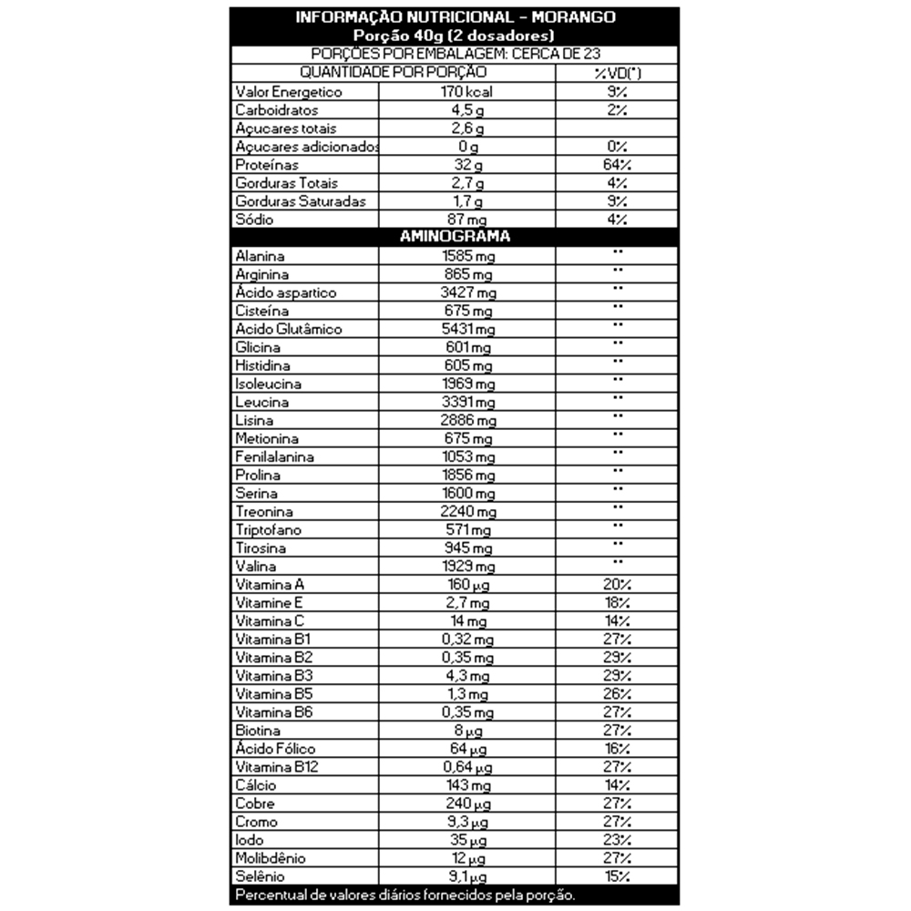 Morango: Proteína concentrada do soro do leite (WPC), proteína isolada do soro do leite (WPI), proteína hidrolisada do soro do leite (WPH), mix de vitaminas e minerais (ácido ascórbico (vitamina C), nicotinamida (vitamina B3), acetato de DL-alfa-tocoferol (vitamina E), D-pantotenato de cálcio (vitamina B5), cloridrato de piridoxina (vitamina B6), riboflavina (vitamina B2), tiamina mononitrato (vitamina B1), sulfato cúprico (cobre), acetato de retinol (vitamina A), ácido fólico, iodeto de potássio (iodo), molibdato de sódio (molibdênio), Picolinato de cromo (cromo), selenito de sódio (selênio), D-biotina (vitamina H), cianocobalamina (vitamina B12)), emulsificante lecitina de soja", aromatizante, edulcorante sucralose e corante artificial amarelo crepúsculo. *utilizada na fabricação da proteína do soro do leite com a função de deixar o produto instantâneo (fácil diluição). NÃO CONTÉM GLUTEN. ALÉRGICOS: CONTÉM DERIVADOS DE LEITE E SOJA. PODE CONTER OVO. CONTÉM LACTOSE.