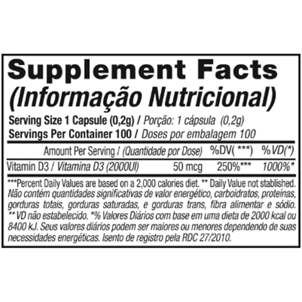 Colecalciferol, óleo de soja (veículo), cápsula: gelatina, água purificada e umectante (INS 422). ALÉRGICOS: CONTÉM DERIVADOS DE ŞOJA. NÃO CONTÉM LACTOSE. NÃO CONTÉM GLÚTEN.