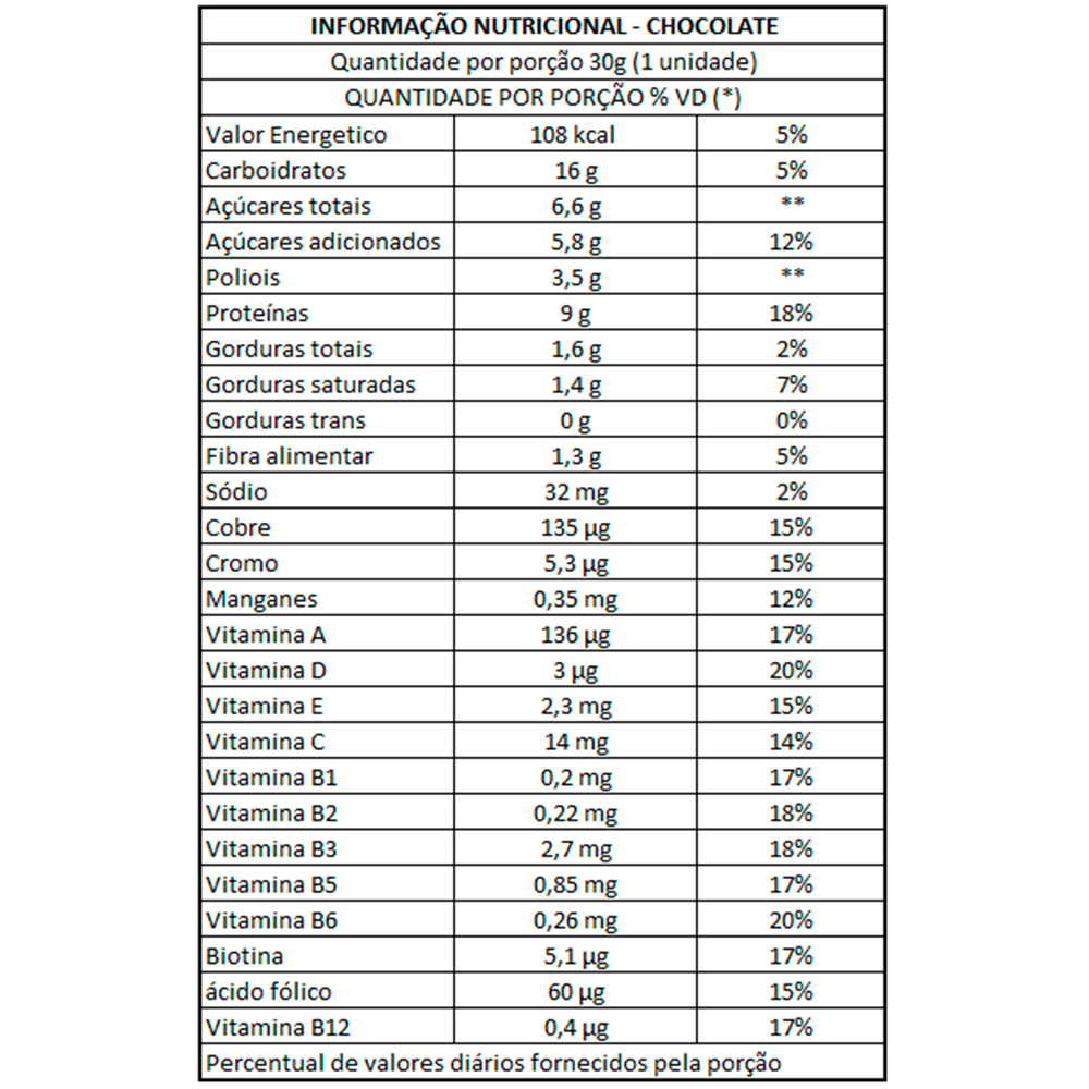 Blend protéico (proteína do leite concentrada), colágeno hidrolisado, proteína do soro do leite isolada e caseinato de cálcio), xarope de frutose, cobertura sabor chocolate ao leite, óleo de palma, Cookies, fruto oligossacarídeo, mix de vitaminas, vitamina C (acido ascórbico), Vitamina B3 (nicotinamida), vitamina E (acetato de tocoferol), Vitamina B5 (Pantotenato de cálcio, vitamina B2 (Riboflavina), Vitamina B6 (piridoxina), Vitamina B1 (tiamina mononitrato), Vitamina A (palmitato de retinol), vitamina B9 (acido fólico), Vitamina H (biotina), vitamina D (Colecalciferol), Vitamina B12 (cianocobalamina), cloreto de sódio, mix de minerais, manganês (sulfato de manganês), cobre (sulfato de cobre), cromo (Picolinato de cromo), edulcorante xarope de maltitol, umectante glicerina, aromatizante, emulsificante lecitina de soja e conservador Sorbato de potássio. Contem derivado de leite e soja, e pode conter amendoim, avelã, castanha de caju e castanha do Pará. NÃO CONTEM GLUTEN.