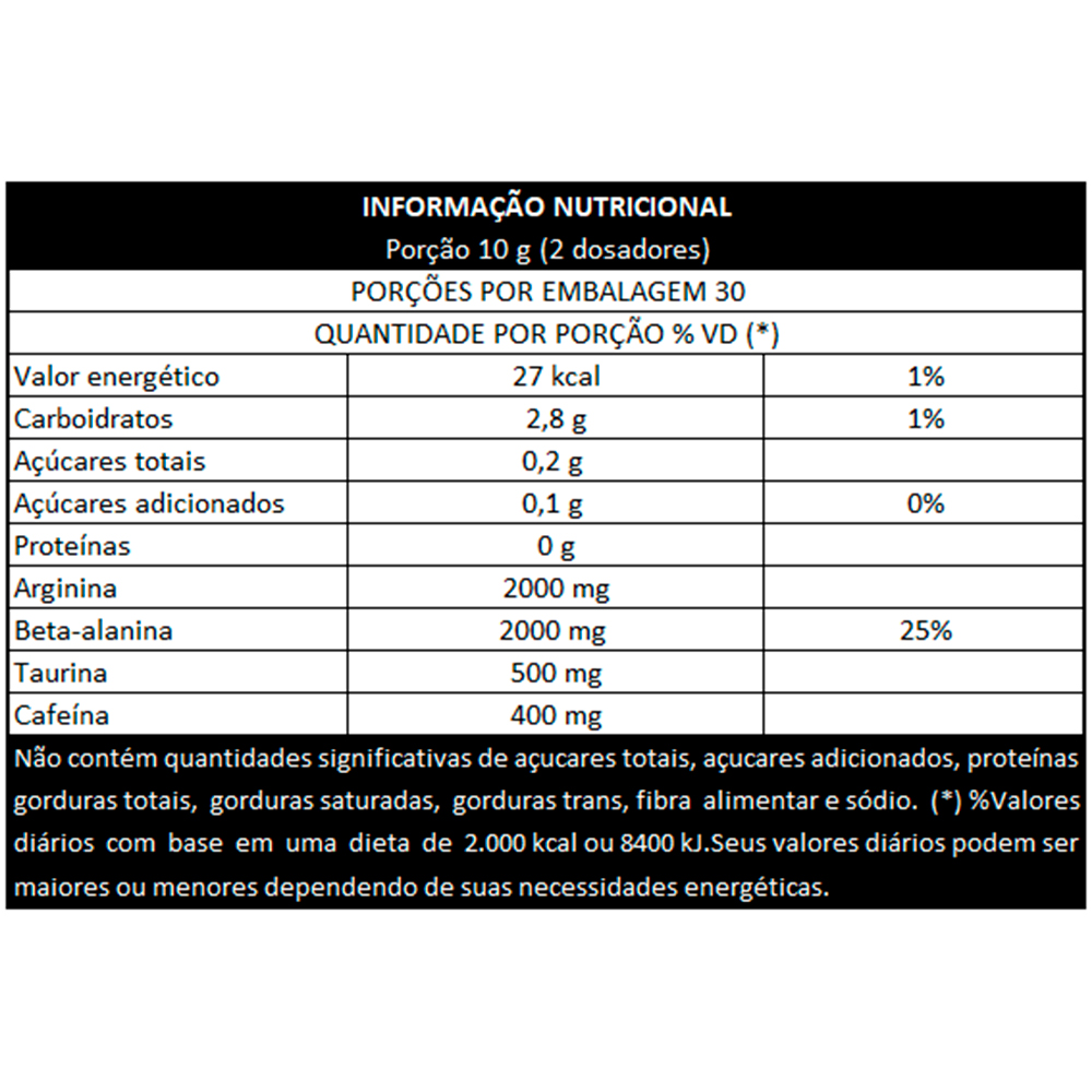 Purple Heart Punch: Cloridrato de L-arginina, beta-alanina, Maltodextrina, taurina, beterraba em pó melancia em pó, cafeína, extrato de laranja amarga, acidulante ácido cítrico, antiumectante dióxido de silício e fosfato tricalcico, aromatizante idêntico ao natural, edulcorante sucralose e Acessulfame de potássio, corante vermelho 40 e azul brilhante FCF. NÃO CONTÉM GLUTEN. ALÉRGICOS: PODE CONTER DERIVADOS DE LEITE E OVO.
