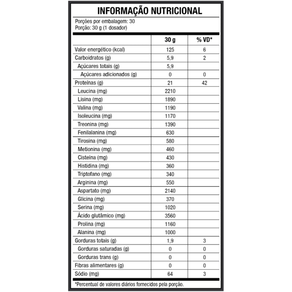Baunilha: Proteína concentrada do soro de leite, proteína isolada do soro de leite, proteína hidrolisada do soro de leite, L-leucina, L-valina, Saborizante, espessante goma xantana, edulcorantes sucralose e acessulfame de potássio.