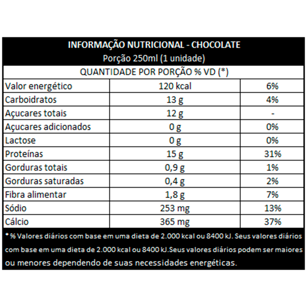 Chocolate: Água, leite em pó desnatado, proteína concentrada de leite, proteína de soro do leite concentrada, cacau em pó, estabilizantes celulose microcristalina, carboximetilcelulose de sódio e carragena, reguladores de acidez fosfato dipotássico e fosfato dissódico, aromatizante e edulcorante sucralose.