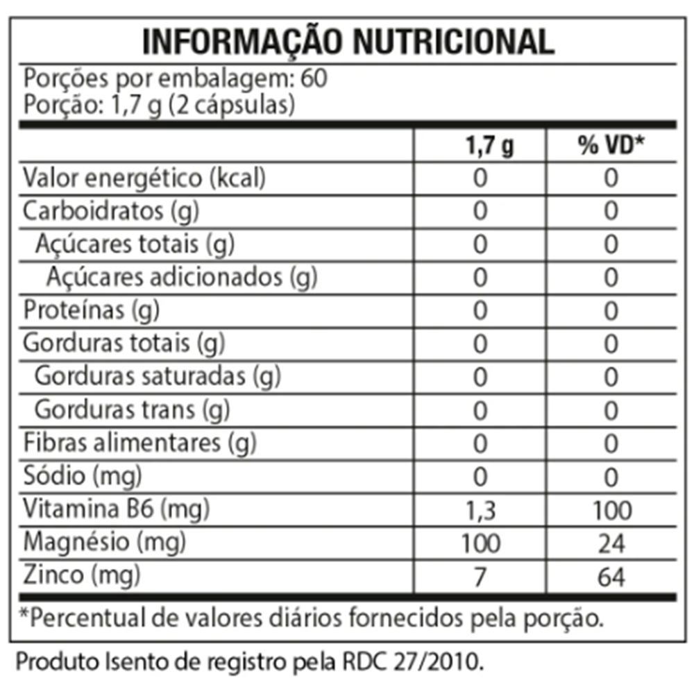 Aspartato de magnésio, aspartato de zinco, cloridrato de piridoxina, estabilizante celulose microcristalina, antiumectante dióxido de silício, corante artificial azul indigotina, amarelo tartrazina, vermelho 40 e cápsula de gelatina. NÃO CONTÉM GLÚTEN.